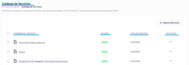 Después de realizar el proceso anterior de crear un servicio, podrá visualizar los servicios creados dentro del catálogo: 📑
